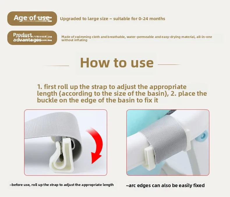 Installation: Adjustable clips/hooks to fit standard baby bathtubs